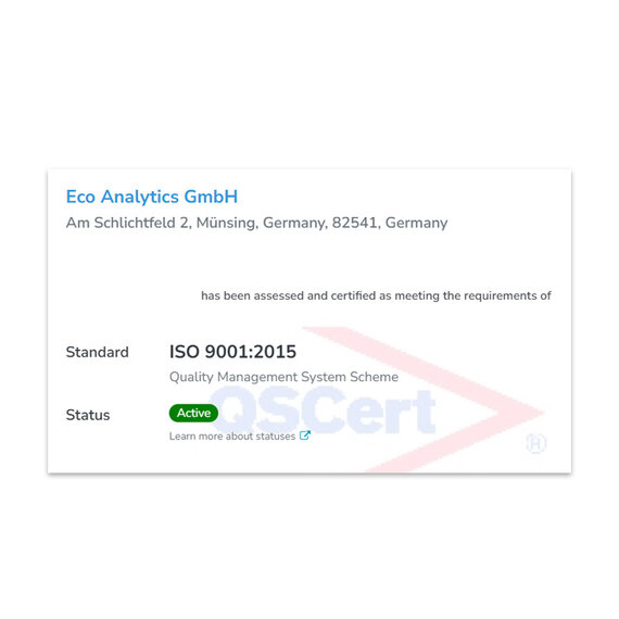 Bei Eco Analytics ist Ihre Sicherheit unser oberstes Gebot. Wir garantieren höchste Qualität, sowohl bei unseren Produkten als auch bei unseren Dienstleistungen. Die Zertifizierung nach ISO 9001 bestätigt, dass wir unsere Prozesse konsequent auf Ihre Bedürfnisse und die unserer Mitarbeiter ausrichten. Dieses Siegel steht für unser Engagement, Ihnen stets das Beste zu bieten.